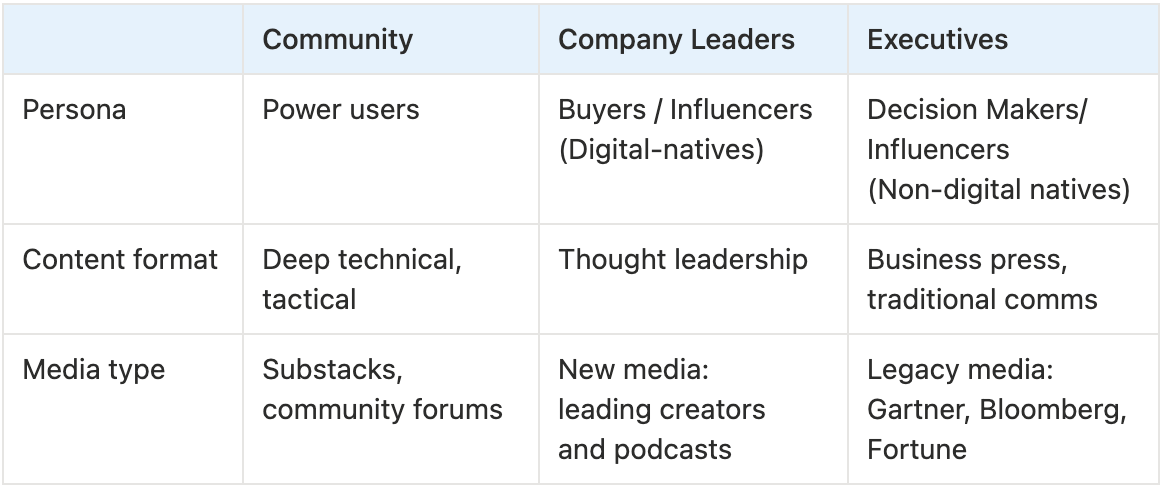 Here’s a helpful framework I used at Statsig. It breaks down a channel into three layers: persona, content format, and media type.
