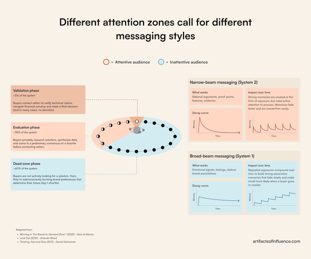But out-of-market buyers are running on System 1: fast, associative, emotionally driven. They’re not paying attention to your category or product; they’re not ready to receive rational arguments. Instead, they’re passively filing away impressions that will shape their preference when they eventually do come in-market.